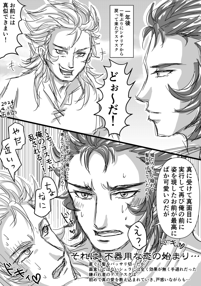 デスマスクは最初からイケメン認定されている(∩゚∀゚)差がわからないですがデスマスクにはボサボサって言わない。毛が長めで滑らかだからか?
